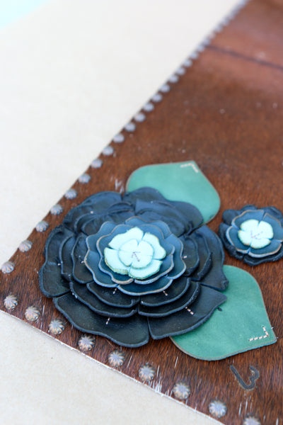 12" x 25" Rectangle Cowhide Centerpiece with Leather Flowers and Leather Leaves